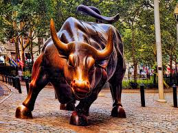 Förhoppningar om rusande aktiekurser, en tjur utanför Wall Street.